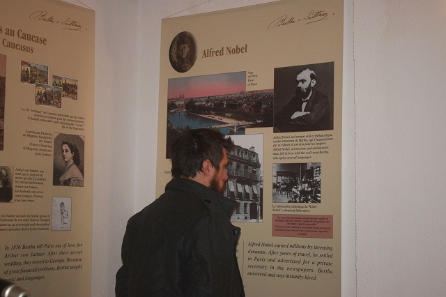 - Dvadeset godina trajalo je blisko prijateljstvo između Berte fon Sutner i Alfreda Nobela. Stalno je pokušavala da podstakne ovog milionera da pokloni veliku svotu za mirovni pokret. Nedjelju dana uoči njegove smrti, 1896. godine, napisala mu je: “A i zato Vas podignutih ruku: nemojte nikada da povučete vašu podršku, nikada, čak ni s one strane groba, koji nas sve čeka.” Tada još nije znala za njegov testament”, piše u propratnom katalogu za izložbu.