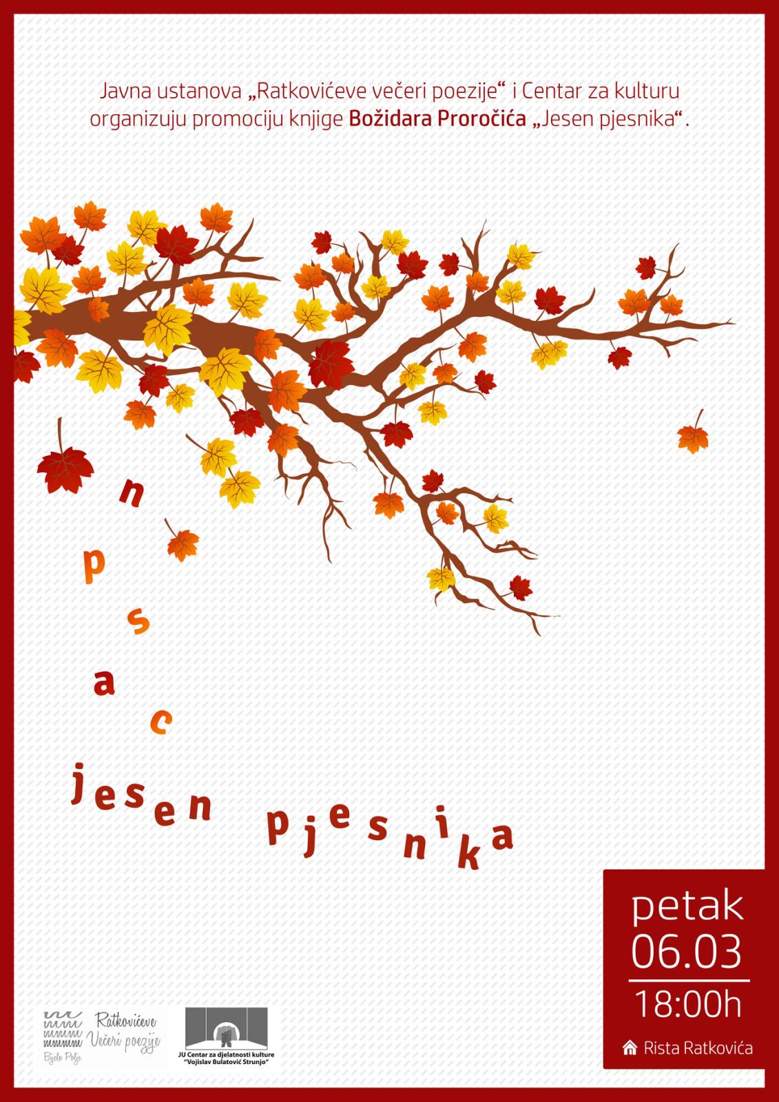 Promocija knjige Jesen pjesnika, autora Božidara Proročića, pjesnika sa Cetinja, biće održana u kući Rista Ratkovića u petak u 18h, u organizaciji JU Ratkovićeve večeri poezije i Centra za kulturu „Vojislav Bulatović Strunjo“.
